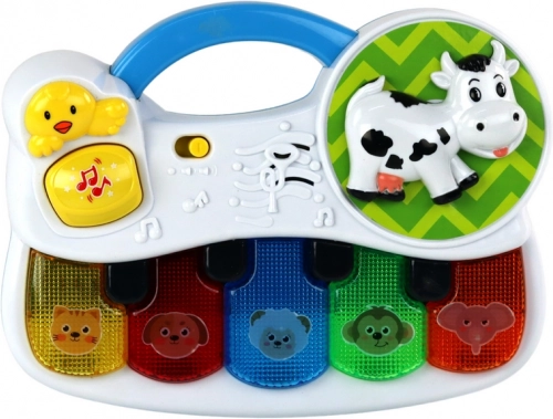 Das kleine, tragbare Piano ist für Kinderhände und die ersten musikalischen Schritte konzipiert. Bunte Tasten mit Tiermotiven laden zum Spielen ein, Lichter belohnen beim Tastendruck visuell und einfache Melodien fördern die natürliche Neugier.