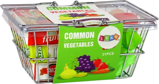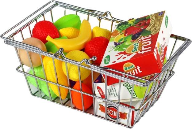 Dieser authentische Kinder-Einkaufskorb aus Metall verwandelt jedes Spiel in echtes Einkaufen. Das Set enthält eine bunte Auswahl an Lebensmitteln – von Obst und Gemüse bis hin zu Pizza und Saft –, sodass Kinder Lebensmittel erkennen üben, zählen und Rollenspiele aus dem Alltag nachspielen können.