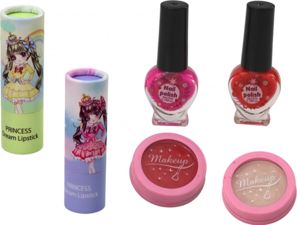 Die obere Ebene enthält Lidschatten (matt und glitzernd), Rouge und Puder, Lippenstifte, Pinsel und Applikatoren für einfaches Schminken. Die untere Ebene ist der Nagelpflege gewidmet – hier finden sich 2 Lacke, Feile, Dispenser und bunte künstliche Nägel. Außerdem sind Ohrclips und ein Armband für den perfekten Style dabei.