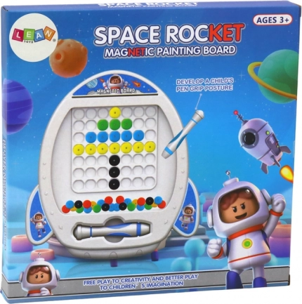 Diese Tafel in Form einer Rakete fördert die Entwicklung der Kreativität und Feinmotorik beim Spielen mit Perlen.