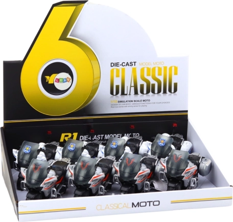 Verfügbar in zwei Varianten - Polizei und Sport. Bitte wählen Sie vor dem Kauf ein Modell aus. Die einzelnen Spielzeuge sind einzeln verpackt, aber im Paket sind 8 Stück enthalten. Die Parameter des Motorrads sind 17cm x 10,5cm x 8cm. Das Spielzeug ist CE-zertifiziert und entspricht den EN71-Standards. Geeignet für Kinder ab 3 Jahren.
