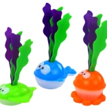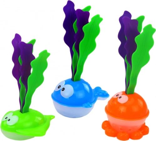 Drei bunte Fische mit verspielten „Algen“ schwimmen an der Wasseroberfläche und laden zum Fangen ein – ideal zum Trainieren von Koordination und Geduld.