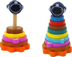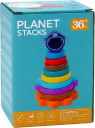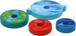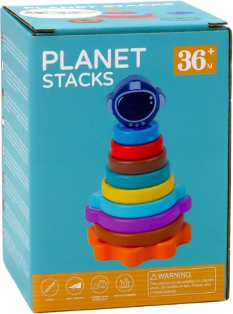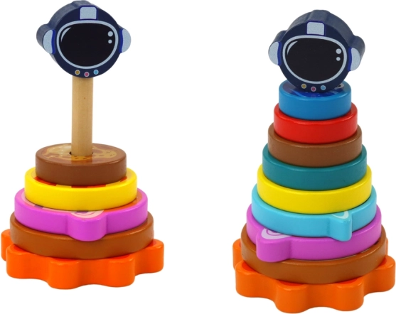 Die hölzerne Stapelpyramide mit Weltraum-Motiv verbindet Spiel und Lernen. Kinder sortieren bunte Ringe – „Planeten“ – nach Größe und trainieren so Vergleichen, Orientierung und Geduld. Das abschließende Teil in Form eines Weltraumhelms sorgt für Erfolgserlebnisse.