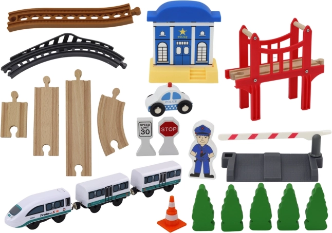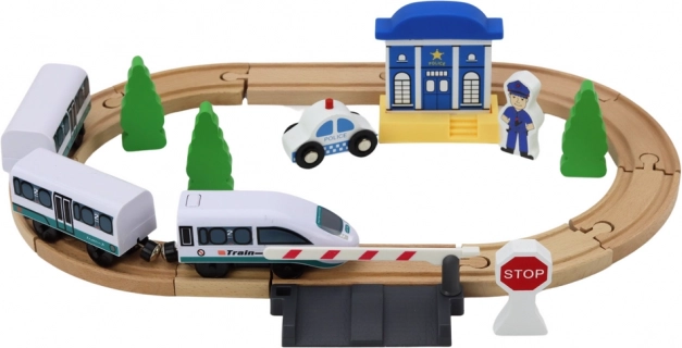 Diese hochwertige Holzeisenbahn eröffnet Kindern die Welt der Eisenbahnabenteuer. Dank der umfangreichen Ausstattung – einschließlich Brücke, Polizeistation, Schranke, STOP-Schild und Polizistenfigur – können sie eigene Geschichten erfinden und ihre Kreativität entfalten. Stabile Holzschienen ermöglichen das Bauen verschiedener Rundkurse mit einer Gesamtlänge von bis zu 3,2 m.