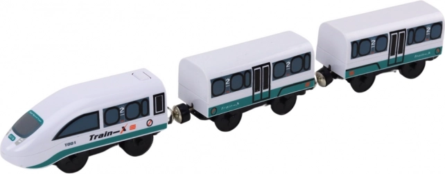Der Train-X-Zug mit koppelbaren Waggons sorgt für eine reibungslose Fahrt auf den Holzschienen. Antrieb mit 1× AA (nicht enthalten).