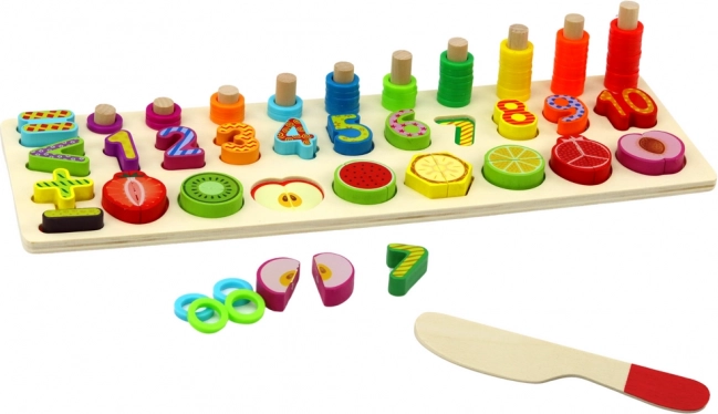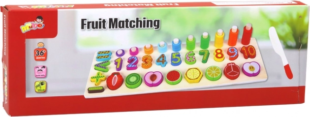 Eingelassene Vertiefungen mit Zahlen und farbigem Obst sind ideal zum Erlernen des Zählens, Erkennen von Formen und Farben sowie zur Förderung der visuell-motorischen Koordination.