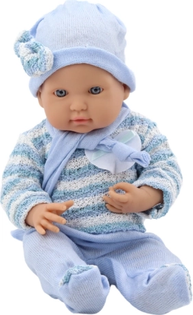 Das gestrickte Jäckchen in blau-weißen Streifen, das passende Mützchen und der Schal sind angenehm zu berühren und laden zum Kuscheln ein. Das Spielzeug besteht aus Materialien, die die Normen CE und EN 71 erfüllen, sodass Sie sich bei täglichem Spiel auf die Sicherheit verlassen können.