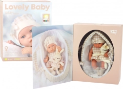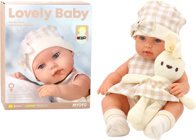 Die Baby-Puppe im Tragegurt ist ein einzigartiges Spielzeug, das Kinder in die Welt der Fürsorge und Betreuung eines kleinen Freundes mitnimmt. Die Puppe trägt ein niedliches beige-weiß kariertes Kleid, ein Mützchen mit Schleife und Söckchen und hat einen kuscheligen Plüschhasen – sie sieht unglaublich süß und einladend aus.