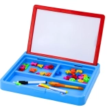 Unter der Tafel befindet sich ein praktischer Stauraum mit 3 Fächern für sämtliches Zubehör – Marker, magnetische Buchstaben und Ziffern sind im Lieferumfang enthalten. Die zweiseitige Ausführung ermöglicht verschiedene Arten des Gestaltens und Lernens, und dank des einfachen Abwischens können Kinder immer wieder neu kreativ werden.