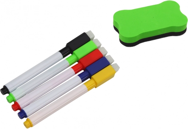 Farbige, trocken abwischbare Marker und ein praktischer Wischer ermöglichen schnelle Korrekturen und neue Versuche – ideal für tägliches Kreativsein ohne große Unordnung.