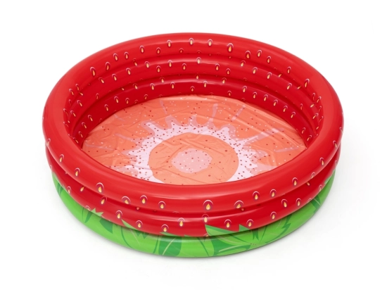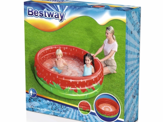 Das aufblasbare BESTWAY Planschbecken mit fröhlichem Erdbeer-Design bietet Kindern an heißen Tagen eine angenehme Abkühlung. Dank der kompakten Maße ist es ideal für Garten, Terrasse und Hof, und seine Drei-Kammer-Konstruktion sorgt für Stabilität und weiche Unterstützung für bequemes Spielen.