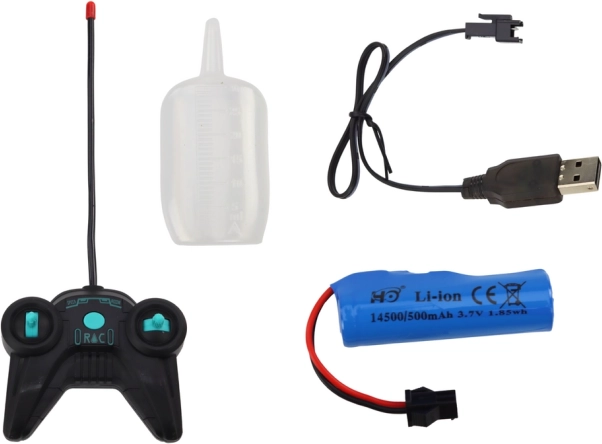 Im Lieferumfang sind ein 3,7-V-Akku und ein USB-Ladekabel enthalten. Die Fernsteuerung benötigt 2× AA-Batterien (nicht enthalten). Einfache Inbetriebnahme.
