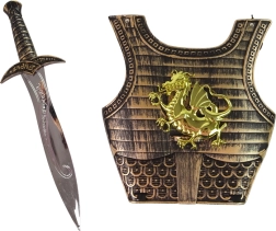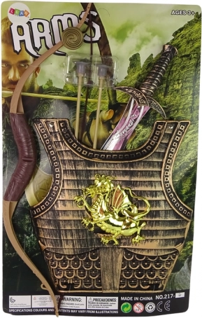 Das komplette Samuraikostüm-Set für Kinder enthält eine goldene Rüstung mit Drachenmotiv, die dank elastischer Gummibänder leicht angepasst werden kann. Das Kostüm ist mit einem komfortablen Schwert mit verschiedenen Mustern am Griff und einem Bogen für präzises Weitschießen ausgestattet.