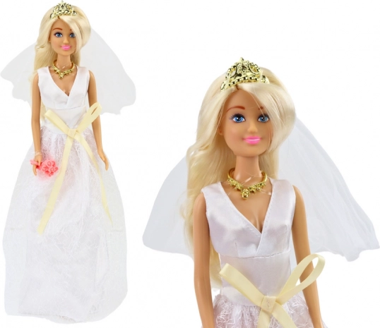 Die Puppe hält ein Bouquet rosafarbener Rosen, was ihren authentischen Look noch mehr unterstreicht. Ihr langes blondes Haar ist ordentlich frisiert und von einem Schleier bedeckt, der sanft über den Rücken fällt.