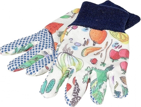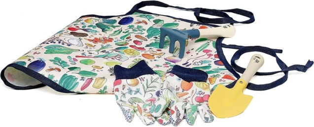 Die bunten Muster auf Schürze und Handschuhen machen Gartenarbeit zu einer freudigen Aktivität.