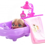 Die kleine Wanne mit Dusche, das Handtuch und das „Shampoo“ ermöglichen Kindern, die tägliche Pflege ihres Haustiers nachzuspielen und sowohl Empathie als auch Feinmotorik zu fördern.
