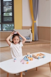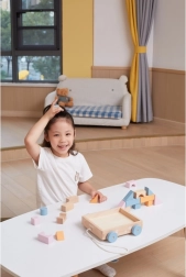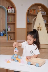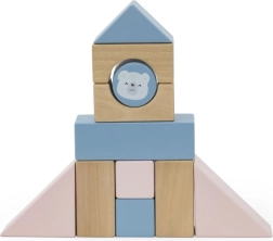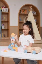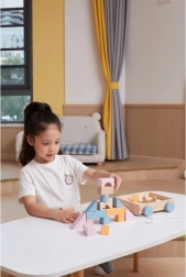 Die Bausteine bestehen aus Buchenholz, sind in harmonischen Farben gestrichen und für Kinder sicher. Nach dem Spielen können die Bausteine zurück in den Wagen gelegt werden, was eine einfache Ordnung ermöglicht. Dank der Schnur kann das Kind den Wagen mit den Bausteinen über den Boden ziehen, was nicht nur Spaß macht, sondern auch praktisch ist.