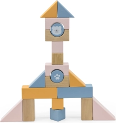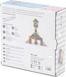 20 Bausteine in verschiedenen Pastellfarben und Formen fördern das kreative Bauen und die Entwicklung handwerklicher Fähigkeiten.