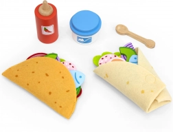 Das VIGA Taco- und Burrito-Set bringt Kindern ein authentisches Kocherlebnis. Weiche Filz-Wraps und farbenfrohe Holz-Lebensmittelstücke (Gemüse, Käse, Fisch u. a.) laden zum Kombinieren der Geschmäcker und zum Erfinden eigener Rezepte ein. Dank Zubehör wie Soßenflasche, „Joghurt“-Schälchen und Holzlöffel wird das Spiel noch abwechslungsreicher.