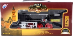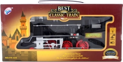 Plastiklokomotive mit 6 AA-Batterien. Größe der Lokomotive ca. 35 cm. Leuchtet, hupt und raucht. Die Lokomotive hat im Inneren eine elektrische Heizspirale und ein spezielles, ungiftiges Rauchöl. Durch das Erhitzen der Spirale entsteht Rauch. Verpackungsmaße ca. 39 × 11,5 × 18,5 cm. Alter 3+