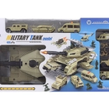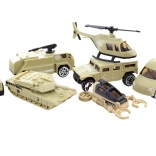 Militärset mit großem Panzer, 6 kleinen Autos und 1 Hubschrauber. Material: Kunststoff. Verpackt im Karton. Verpackungsmaße ca. 46 × 23,5 × 11 cm. Alter 3+