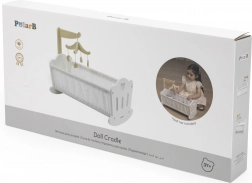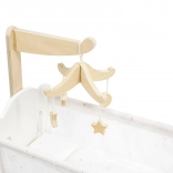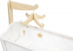 Die Holzwiege für Puppen PolarB verbindet zeitloses Design, hochwertige Verarbeitung und zarte Textilien mit Sternchen- und Mondmotiven. Das integrierte Holz-Mobile mit hängenden Formen verleiht dem Spiel Magie und hilft Kindern, Fürsorge und beruhigende Rituale zu entwickeln.