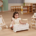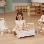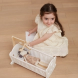 Dank der stabilen Holzteile und dem beigefügten Kissen mit Decke entsteht für die Puppe ein gemütlicher Ruheplatz. Die Wiege passt perfekt ins Kinderzimmer und unterstützt soziale Fähigkeiten, Vorstellungskraft sowie fein- und grobmotorische Entwicklung.