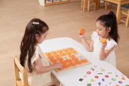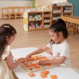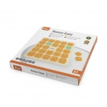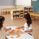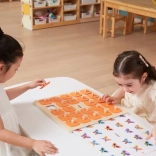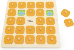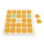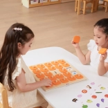 Die massive Holztafel mit 25 quadratischen Feldern und orangefarbenen Abdeckplättchen mit Griffen ist robust und angenehm für kleine Kinderhände.