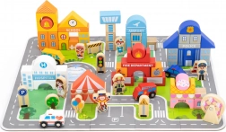 Dieses hochwertige Holz-Bauset bringt Kindern eine komplette Stadt auf eine Spielunterlage. Mit den 20 Puzzleteilen werden zuerst Straßen und Flächen gelegt, anschließend entstehen aus 60 farbigen Bausteinen die Gebäude. Fahrzeuge, Figuren verschiedener Berufe sowie Zubehör wie Bäume und Verkehrsschilder sorgen für ein noch realistischeres Spiel.