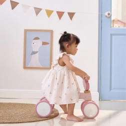 Robustes Holz, glatte und abgerundete Kanten sowie unbedenkliche Farben machen das Rutschfahrzeug zu einer langlebigen und sicheren Wahl für die ersten Fahrten.