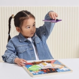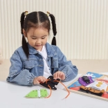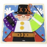 Die unterhaltsame Holztafel der Marke VIGA mit einem kleinen Zauberer vermittelt Kindern ab 18 Monaten die Grundlagen des An- und Ausziehens sowie der Selbstständigkeit. Beim Spielen üben sie Reißverschlüsse, Knöpfe, Druckknöpfe, Schnallen und Schnürsenkel, entwickeln Feinmotorik, Auge–Hand–Koordination und Selbstständigkeit. Unter der Kleidung verbergen sich außerdem magische Elemente, die als spielerische Gedächtnis-Aktivität dienen.