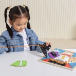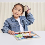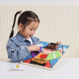 Unter den einzelnen Kleidungsteilen verbergen sich thematische Motive (Häschen, Karten, Taube, Blumenstrauß), die das Spiel um einfache Merkspiele und das Erzählen von Geschichten erweitern. Die Tafel ist von den Prinzipien der Montessori-Pädagogik inspiriert – sie weckt Neugier, unterstützt die Konzentration und stärkt das Selbstvertrauen des Kindes.