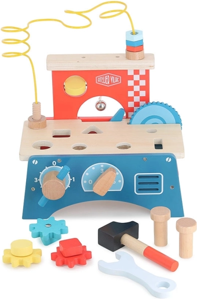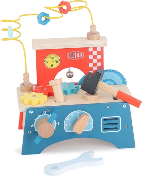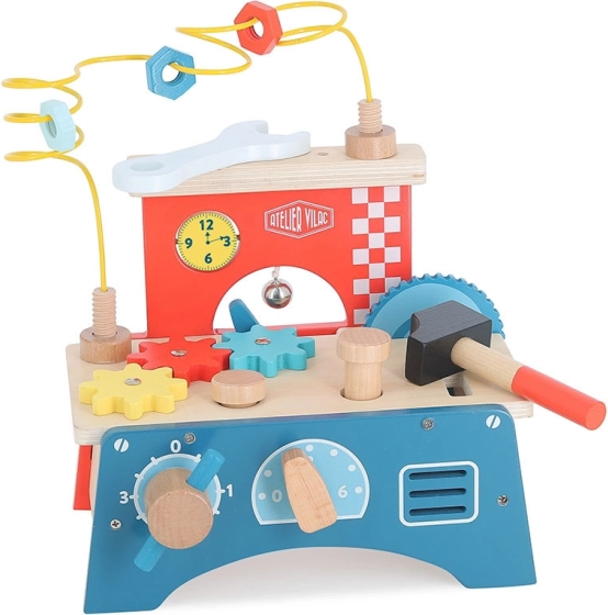 Der Multi-Aktivitätstisch der Marke Vilac ist so gestaltet, dass er die Entwicklung von Kindern in verschiedenen Bereichen unterstützt. Er enthält ein Hämmerchen, ein Glöckchen, Zahnräder und viele weitere Elemente zur Förderung der Sinne und motorischen Fähigkeiten. Von der Montessori-Methode inspirierte Spielzeuge unterstützen die natürliche Entwicklung des Kindes, betonen Selbstständigkeit und Entdecken. Kinder lernen, miteinander zu spielen, was die Entwicklung ihrer sozialen Fähigkeiten unterstützt.