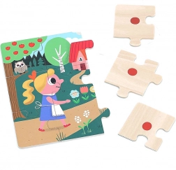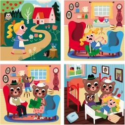 Vier einzelne Puzzles mit je 9 Teilen erzählen Schritt für Schritt das Märchen von Goldlöckchen und fördern Fantasie und Erzählfreude der Kinder.