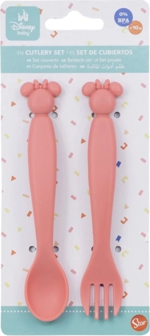 Set aus zwei Kinderbesteckteilen aus Kunststoff mit Endstücken in Minnie-Form.