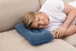 Dieses aufblasbare Kissen ist leicht und benötigt nach dem Zusammenlegen minimalen Platz. Ideal für Reisen und Camping.