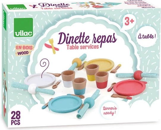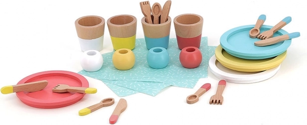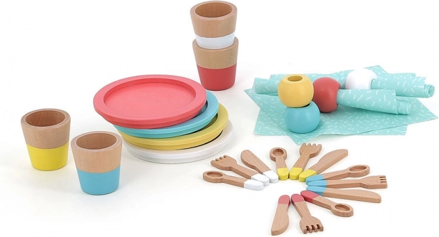 Dieses Holz-Essgeschirr-Set bietet Kindern ein authentisches Erlebnis der Spielküche. Bunte Teller, Becher, Löffel, Gabeln und Messer sowie Servietten und Ringe regen zum Rollenspiel an, fördern die Feinmotorik und unterstützen Zusammenarbeit und Kommunikation unter Kindern.