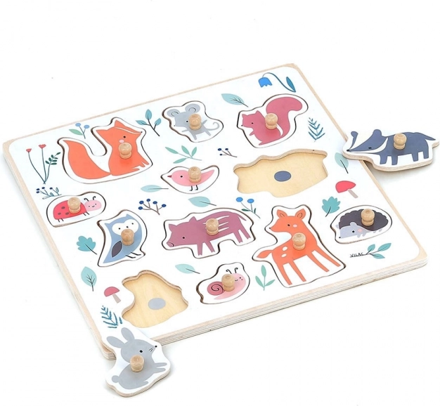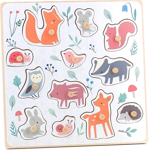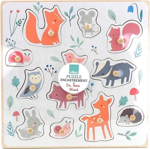 Fuchs, Maus, Eichhörnchen, Marienkäfer, Vogel, Dachs, Eule, Schweinchen, Hase, Schnecke, Reh und Igel – ideal, um den Wortschatz zu erweitern und Formen sowie Farben kennenzulernen.