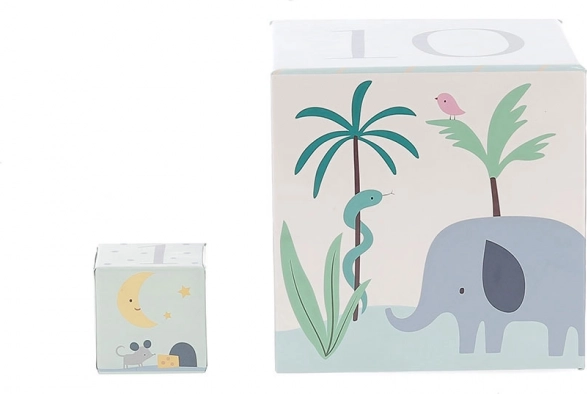 Dieses erste Würfel-Set passt sich dem Entwicklungstempo Ihres Kindes an: von einfachen Greif- und Stapelspielen über das Bauen eines Turms bis hin zum Lernen der Zahlen 1–10. Jeder Würfel ist mit liebevollen Illustrationen von Tieren aus aller Welt und klaren Ziffern versehen, die ganz natürlich zum Entdecken und Benennen anregen.