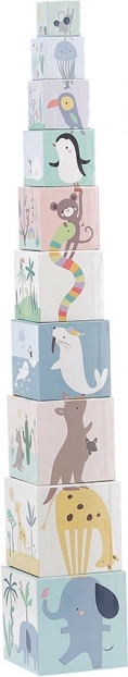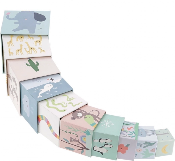 Die Würfel bestehen aus hochwertiger, leichter und robuster Pappe. Durch die abgestuften Größen lassen sie sich leicht aufeinanderstapeln und ineinanderstecken, sparen Platz und sind auch ideal für unterwegs. Das Design von Sarah Betz unterstreicht die Verspieltheit und fördert Fantasie sowie Konzentration.