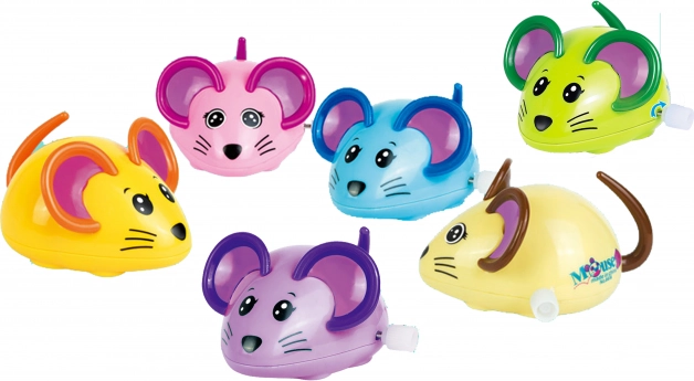Verspielte Kunststoff Aufziehmaus 8 cm in sechs Farben. Ideales Spielzeug für Kinder. Wird in einer Packung mit 12 Stück verkauft.