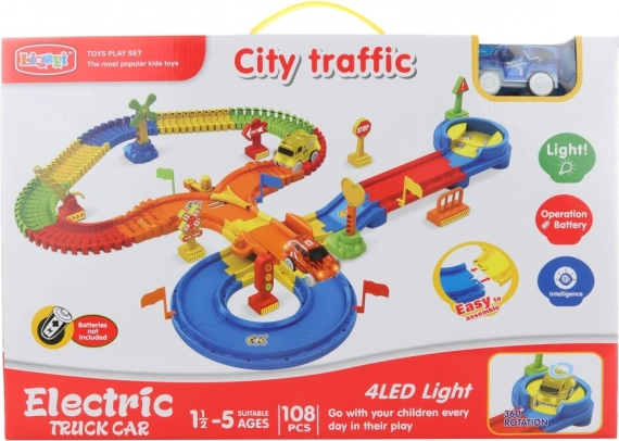 Diese Strecke mit Auto ist aus hochwertigem Kunststoff gefertigt und für Kinder ab 18 Monaten geeignet. Nach dem Einlegen von 1 AA-Batterie (nicht im Lieferumfang enthalten) leuchtet das Auto auf und beginnt seine Fahrt auf der Strecke. Das Set enthält insgesamt 108 Teile, die den Aufbau verschiedener Formen und Strecken ermöglichen, die Kinder erkunden können. Aufgrund seiner Größe ist die Bahn leicht zu transportieren und kann je nach Bedarf einfach verstaut oder aufgebaut werden.