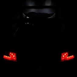 Front- und Rück-LEDs, übersichtliches Cockpit mit Schlüssel und Audio-Panel: MP3, USB, SD, AUX, Bluetooth und FM-Radio. Ebenfalls dabei: Sounds am Lenkrad und Batteriestandsanzeige.