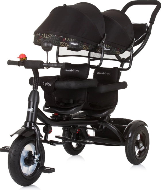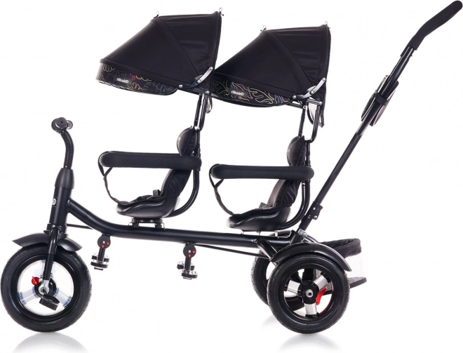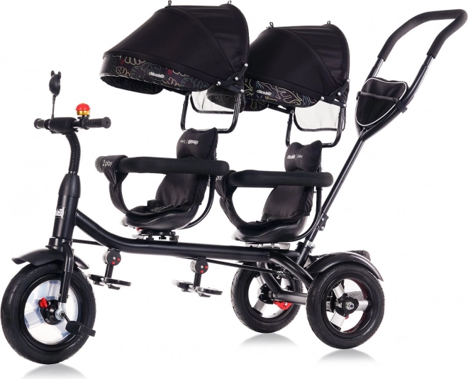 Beide Sitze sind mit Sicherheitsbügeln, Gurten und verstellbaren Fußstützen ausgestattet. Zwei große klappbare Dächer schützen vor Sonne, Schutzbleche an allen Rädern und eine Abdeckung am Vorderrad erhöhen die Sicherheit. Hochwertige Gummiräder sorgen für eine leise und bequeme Fahrt, die Hinterräder verfügen über Brems-Pedale für sicheres Anhalten. Klingel, Spiegel, geräumiger Heckkorb und Tasche für Kleinigkeiten sind ebenfalls dabei.