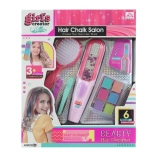 Set für kleine Friseurinnen. Die Packung enthält Haarkreiden, einen Applikator, eine Haarbürste und zwei Spangen. Verpackt in einer Schachtel. Verpackungsmaße ca. 26×31×6 cm. Alter 5+.