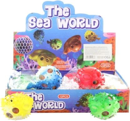 Anti-Stress-Quetschball in Form eines Kugelfisches, aus dem Masse herausquillt. Größe ca. 9 × 5 × 6 cm. Verpackt im Beutel. Alter 3+