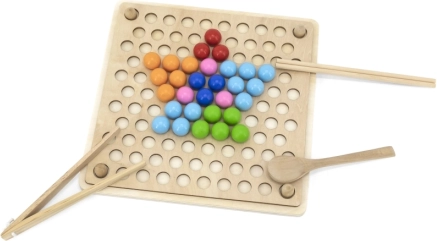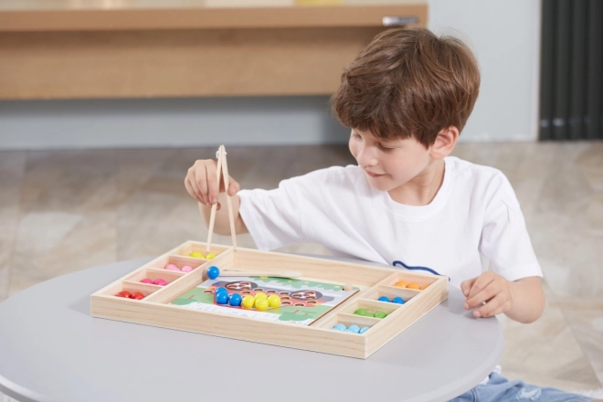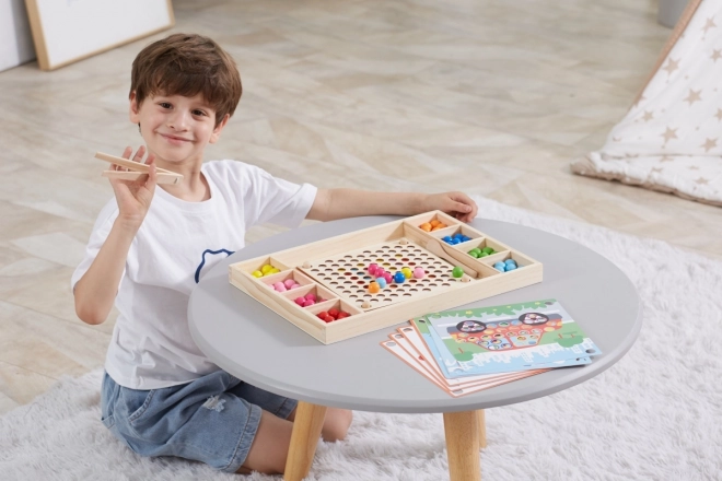 Das Holz-Bildungsspiel "Fang und Sortiere" ermöglicht es Kindern, verschiedene Muster und Farben entweder anhand von beigelegten Papierbögen oder ihrer eigenen Fantasie auszuprobieren. Mit diesem Spiel haben Kinder die Möglichkeit, Papier auf ein Holztablett zu befestigen und mit Hilfe von Stäbchen, einem Löffel oder einem Clip farbige Kugeln in die Löcher auf der Platte zu legen. Am Ende können Kinder schöne Bilder erstellen.