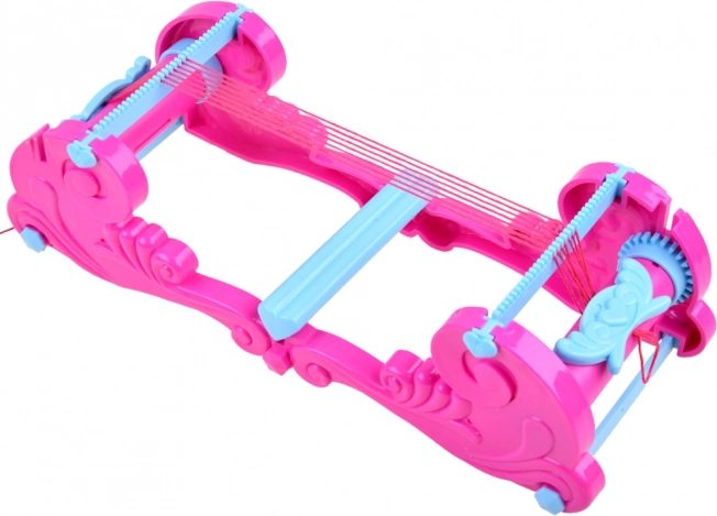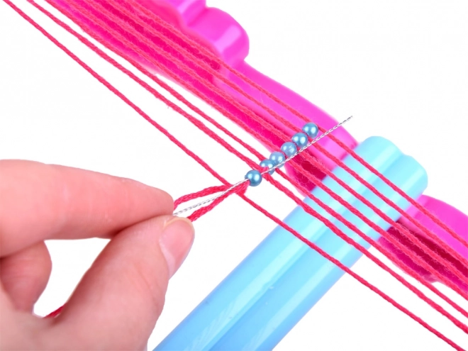 Der rosa-blaue Rahmen hält die Fäden sicher an Ort und Stelle und ermöglicht bequemes Auffädeln von Perlen sowie regelmäßige Muster.
