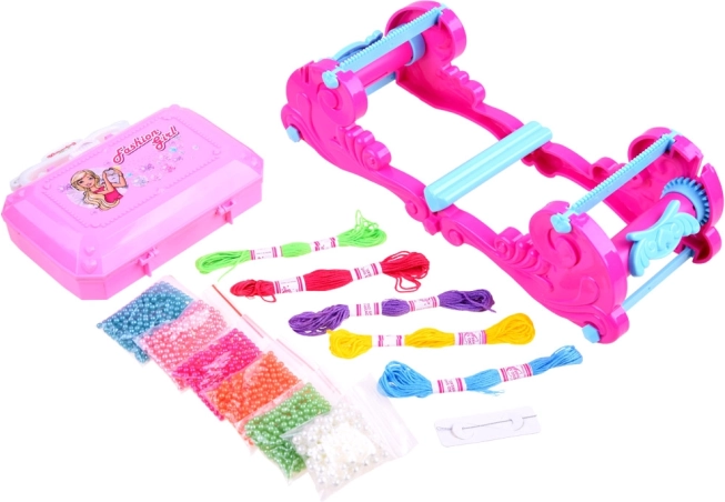 Webrahmen für Armbänder, Kunststofftruhe mit Spiegel, 5 farbige Stickgarne, weiße Perlenschnur, 5 Sets Perlen