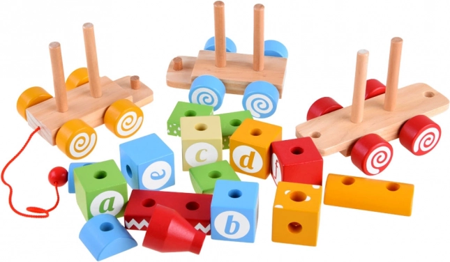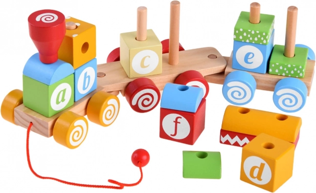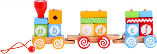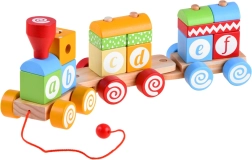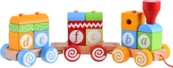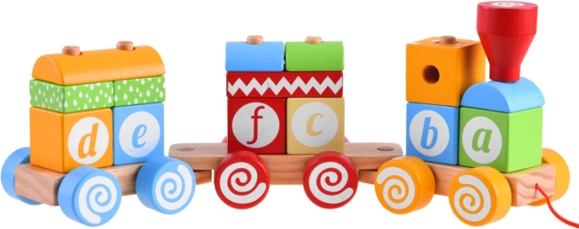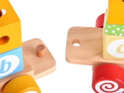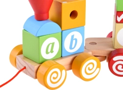 Abnehmbare Teile der Eisenbahn ermöglichen es dem Kind, Formen zu erkennen, sie zusammenzusetzen und eigene Waggons zu bauen. Jeder Block ist mit einem Buchstaben versehen, was hilft, die ersten Buchstaben im Gedächtnis zu behalten.